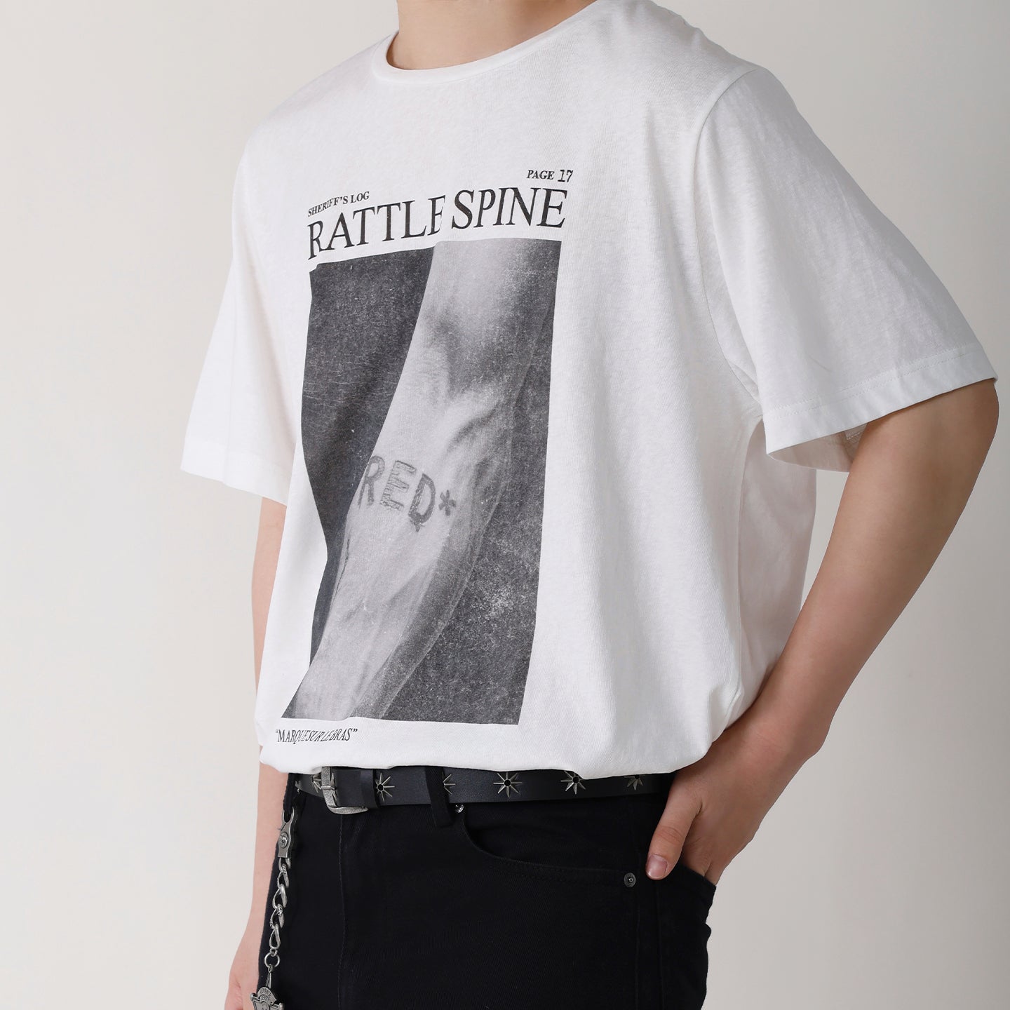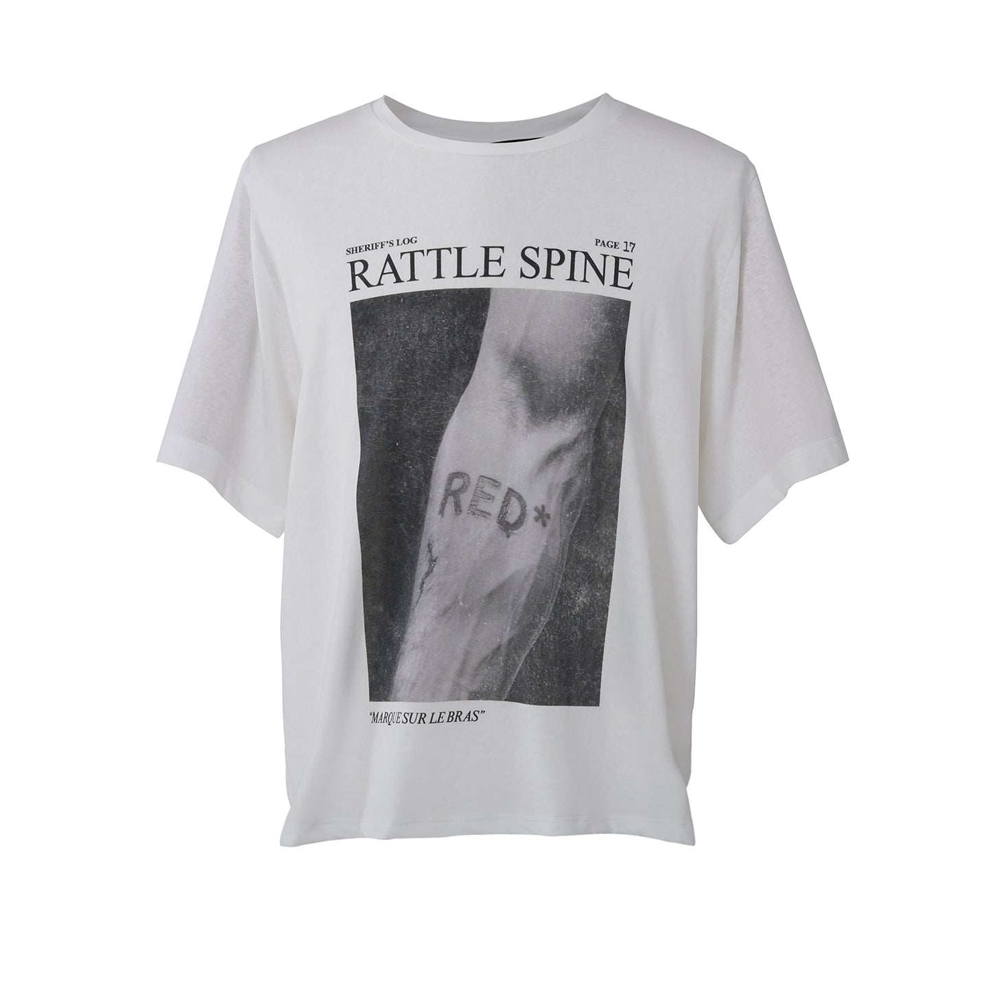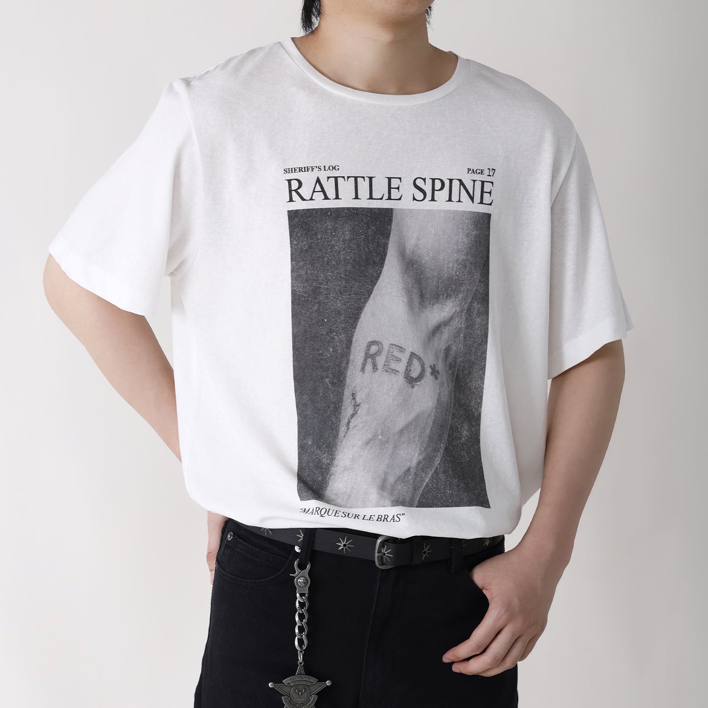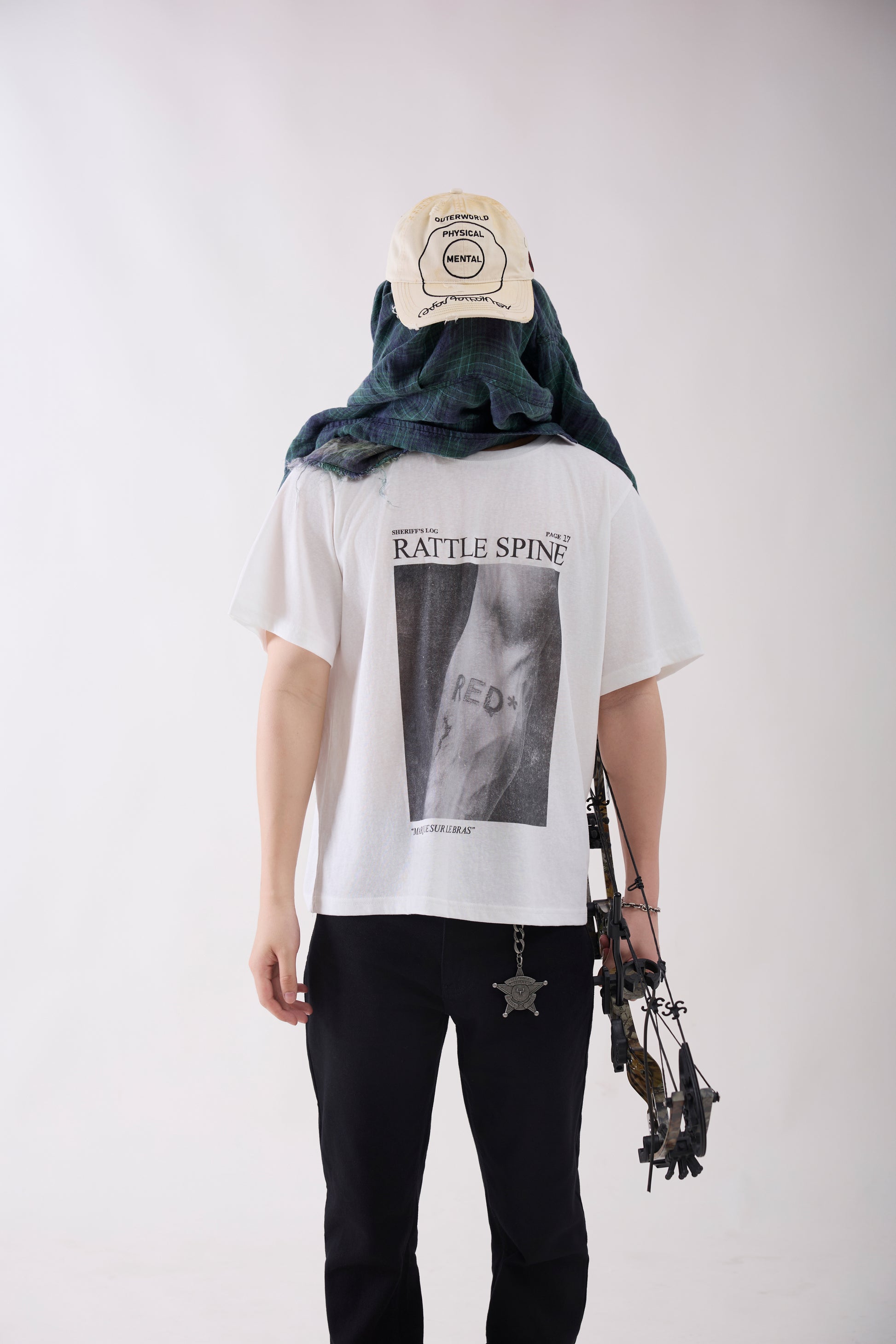 Crafted from 180g slub cotton with a boxy silhouette, this tee features a hand-aged print replicating the scarred marks left behind in the sheriff’s case logs.
