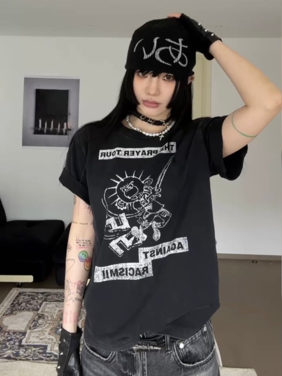 The cracked print and garment-washed finish are designed to recreate an authentic vintage “worn-in” look.