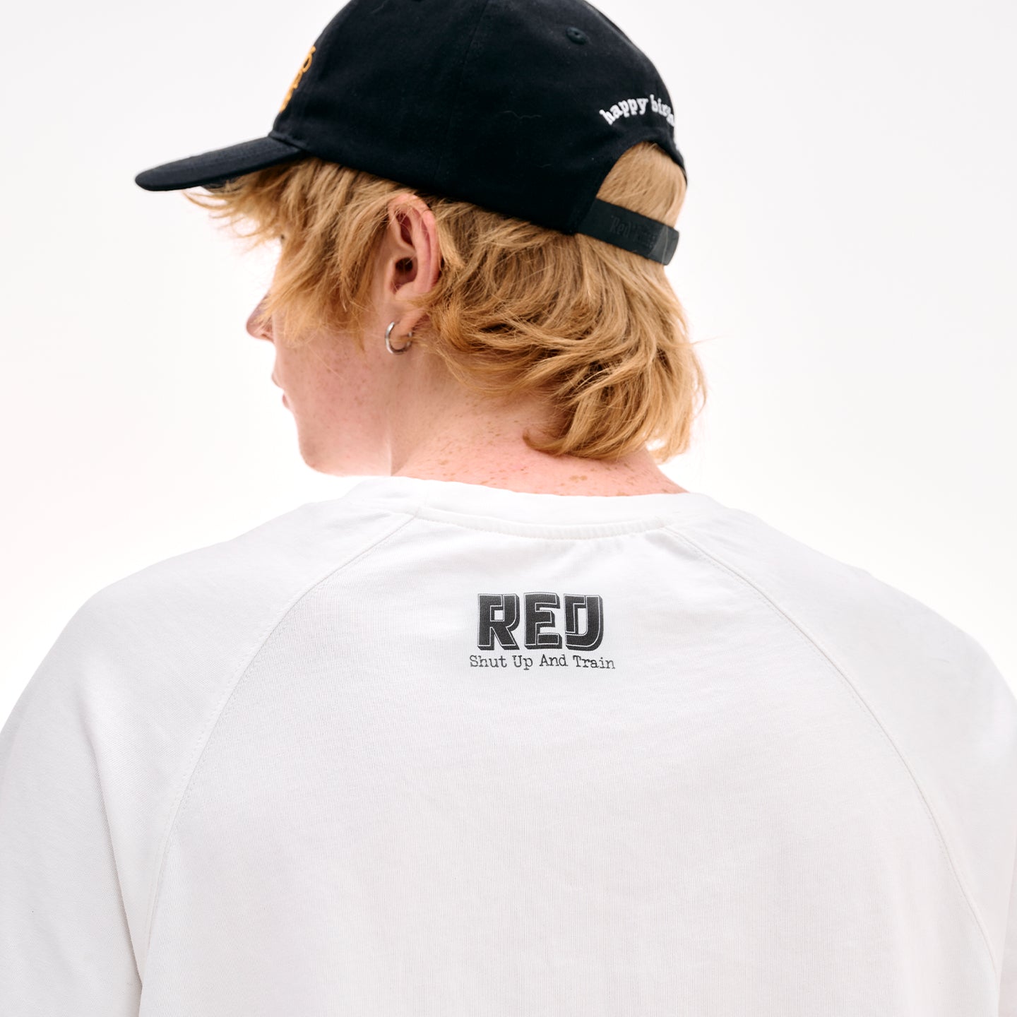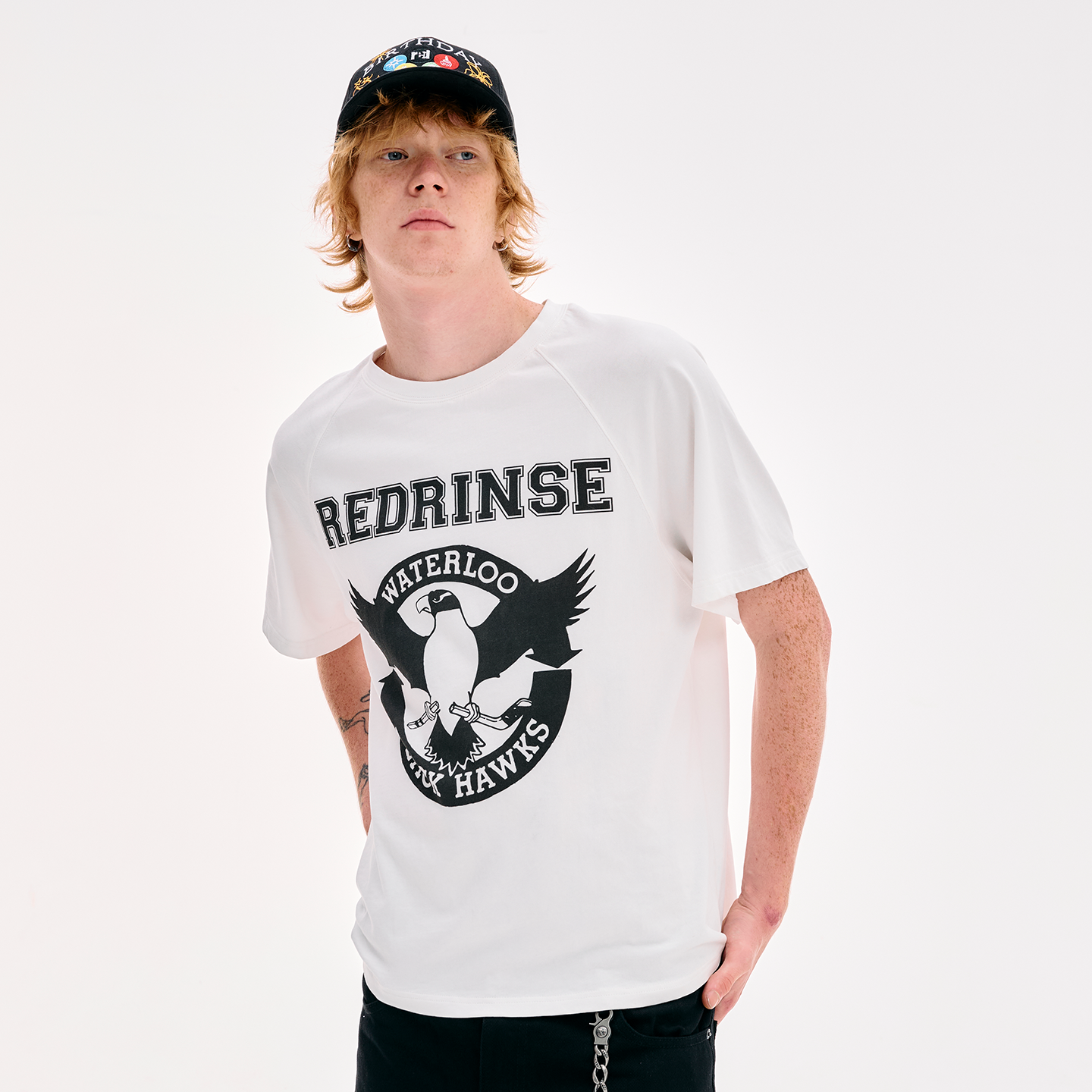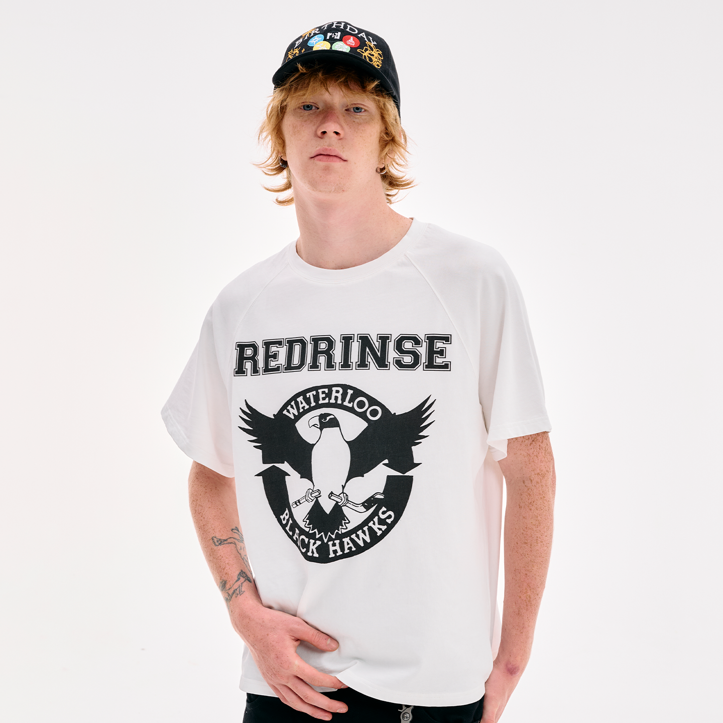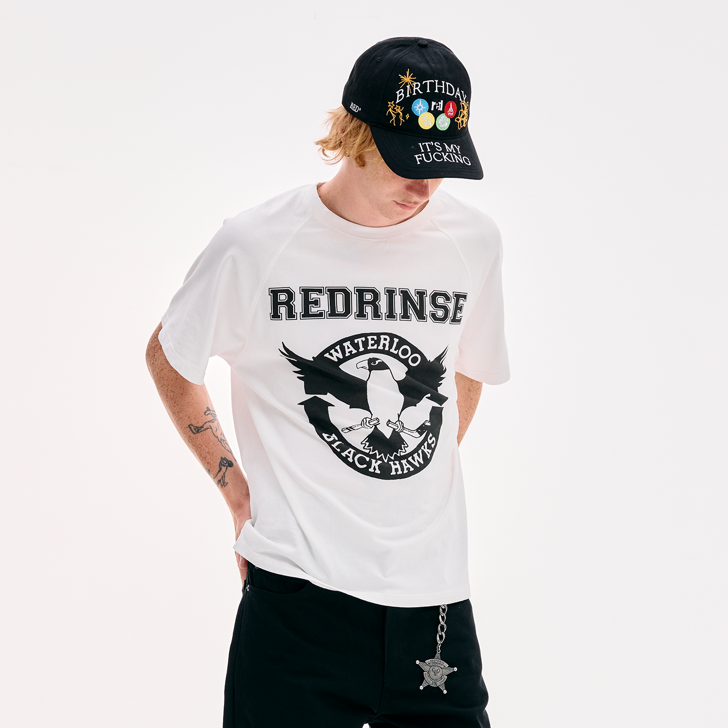 REDRINSE「旷野之息」系列夏季單品,以 220g 高密純棉結合白墨直噴印花,還原西部世界黑鷹意象與美式球衣結構。象牙白復古做舊工藝+插肩袖剪裁,搭配 BOXY 短身輪廓,打造符合亞洲身型的街頭百搭短袖 T 恤。